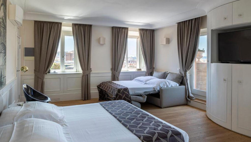 Wer Rom mit Kindern besucht, kann diese Unterkunft als Doppelzimmer mit Verbindungstür für 4 Personen buchen, oder sich für ein Apartment mit 2 Schlafzimmern für maximal 6 Personen entscheiden.